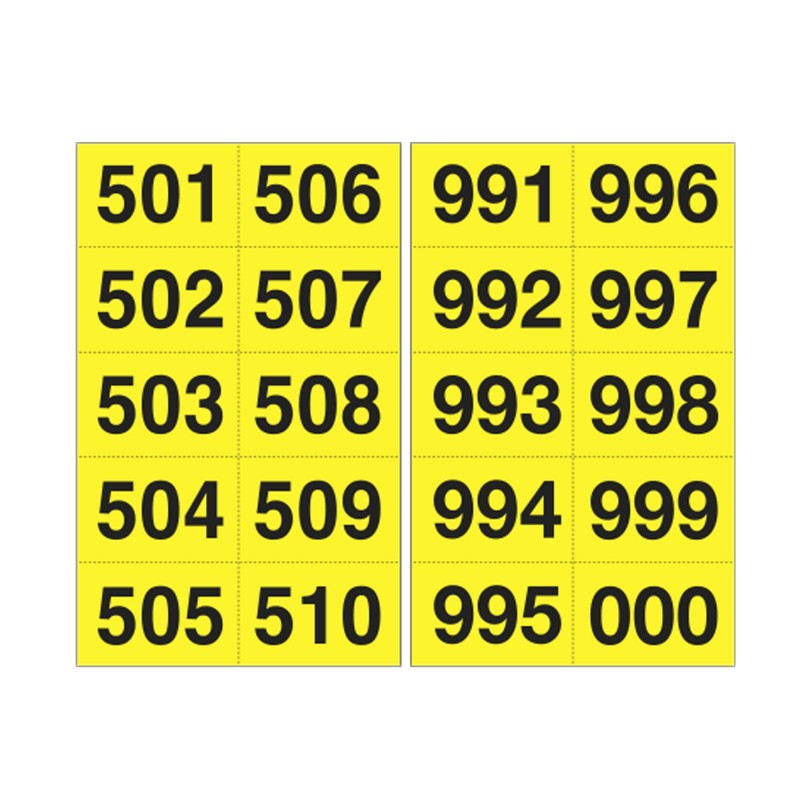 Numero adesivo da 501 a 999 - 45 x 24 mm - 10 et/fg - 50 fogli - nero/giallo