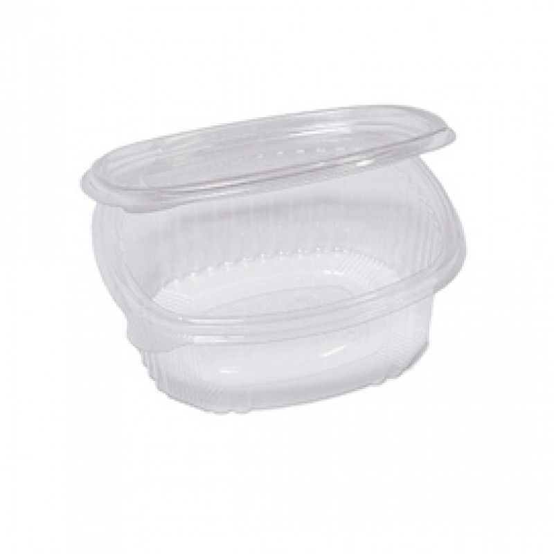 Contenitori ovali in PET con coperchio incernierato. Ideali per cibi freddi, con conservazione in frigo e freezer.