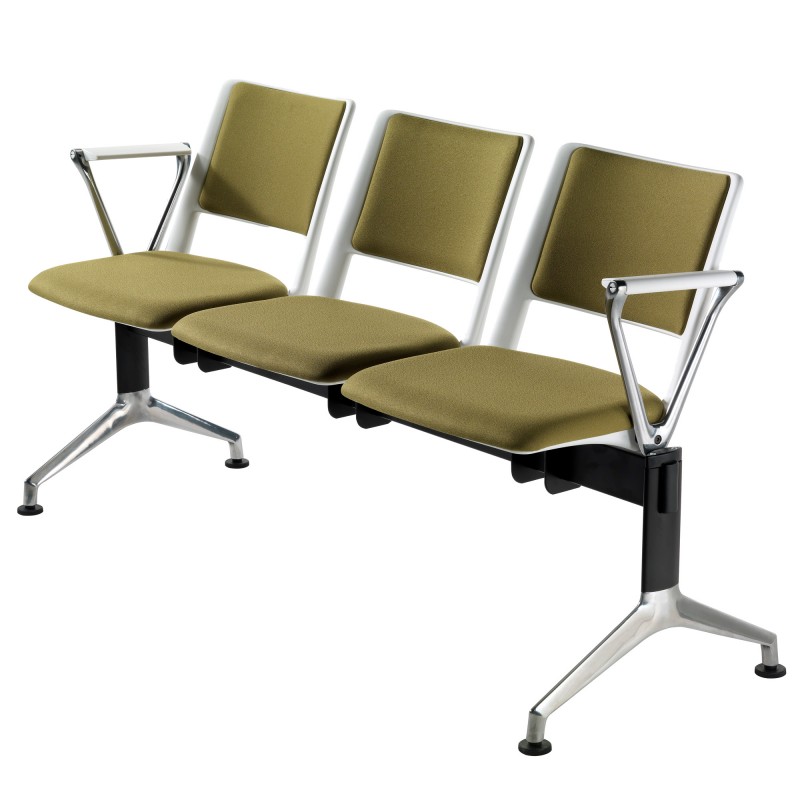 Panca a 3 posti - gamba in acciao e alluminio - con braccioli fissi. Rivestimento seduta in tessuto "SUPER - King L" 100% TREVIRA e reazione al fuoco classe 1. Alt.tot: 80cm; Prof.tot: 54cm; Alt.schienale: 37cm; Largh.schienale: 44cm; Largh.sedile: 45cm; Prof.sedile: 41cm; Alt.sedile: 45cm. Largh. totale: 153cm. Certificazioni: EN 16139 : 2013.