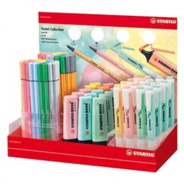 Espositore da banco con 15 Stabilo Boss Original Pastel assortiti in 6 colori, 16 Stabilo swing cool Pastel, 40 Stabilo Pen 68 assortiti in 8 colori e 40 Stabilo Point 88 assortiti in 8 colori.