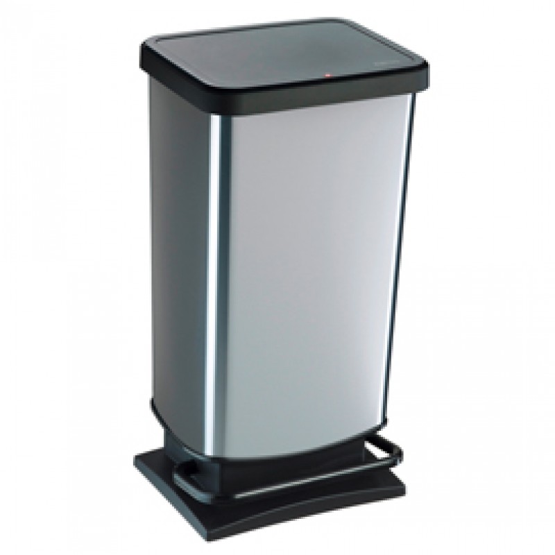 Pattumiera in PPL metallizzato con apertura a pedale. Elegante e comodo con spazio di raccolta ottimizzato. Chiusura soft con meccanismo pneumatico. Portasacchetti nascosto. Dimensione: 35x26x68cm - 40lt. Colore nero/argento.