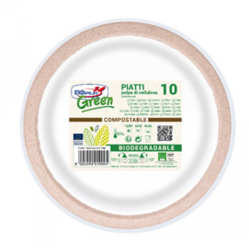 Piatti piani in Polpa. Diametro 22cm. Colore: Kraft. Compostabili. Max 90° per 15'. Microonde: 800 Watt per 2'. Forno: Max 100°C per 30'.