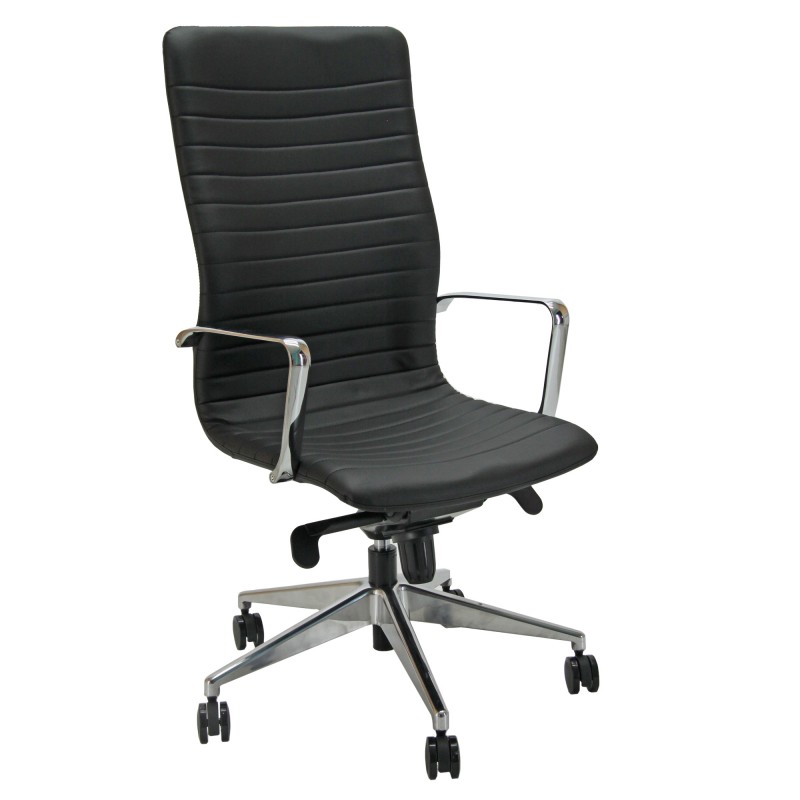 Poltrona direzionale girevole - sedile e schienale in multistrati di legno - elevazione a gas - meccanismo oscillante con blocchi - braccioli in acciaio cromato e base in alluminio. Rivestimento seduta in tessuto "PLUS - Eco Leather" idrorepellente, facile da pulire, senza flatati e flame retardant. Braccioli inclusi (non rimovibili). Alt.tot.: 108-117cm; Prof.tot.: 70cm; Alt.schienale: 66cm; Larg.schienale: 50cm; Larg.seduta: 50cm; Prof.Sedile: 48cm; Altezza sedile: 44-54cm.