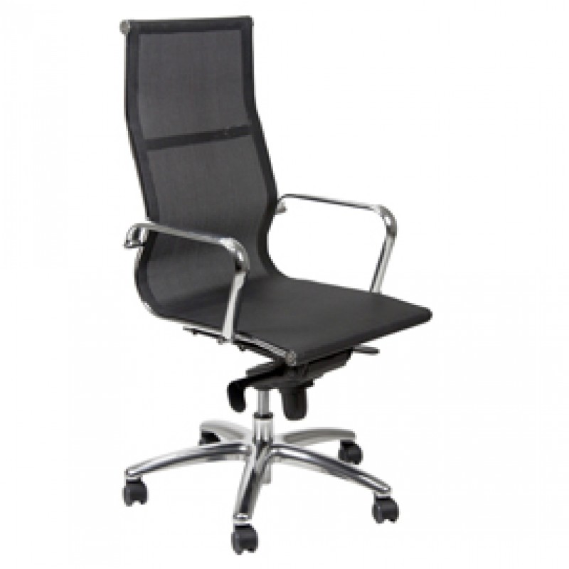 Poltrona direzionale adatta ad un uso intenso. Base in acciaio cromo Ø66cm. Struttura in acciaio tubolare ellittico cromo. 5 ruote in nylon Ø5cm. Sedile in rete. Braccioli inclusi. Meccanismi: elevazione a gas, meccanismo oscillante con blocchi. Schienale fisso con supporto lombare.