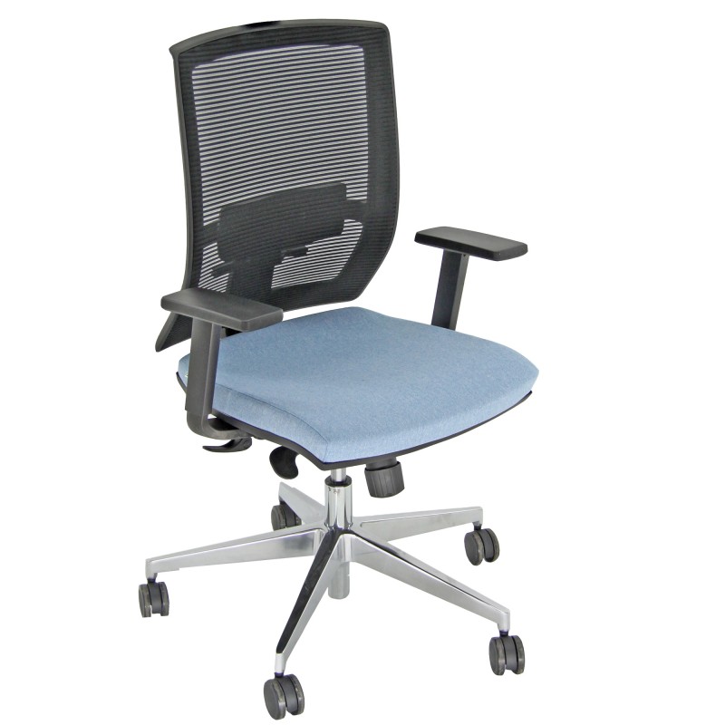 contatto permanente - supporto lombare regolabile up down - base alluminio pressofuso; Rivestimento seduta in tessuto "SUPER - King L" 100% TREVIRA reazione al fuoco classe 1. Completa di braccioli regolabili. Alt.tot.: 103-114cm; Prof.tot.: 70cm; Alt.schienale: 59cm; Larg.schienale: 48cm; Larg.seduta: 47cm; Prof.Sedile: 47cm; Altezza sedile: 43 - 54cm.