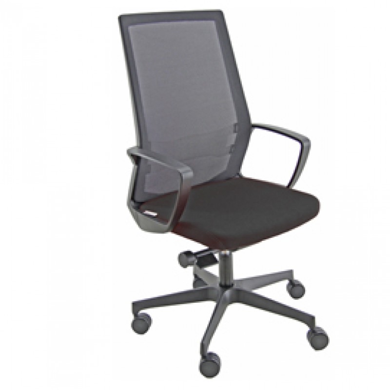Poltrona ergonomica adatta per uso intenso. Schienale in rete semitrasparente con supporto lombare regolabile. Meccanismo synchro con 4 blocchi antishock, traslatore e variatore di forza a contatto permanente. Scocca integrata ai braccioli. Elevazione a gas.