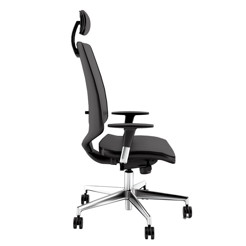 Seduta ergonomica semidirezionale con elevazione a gas - meccanismo synchro - meccanismo anti shock - meccanismo a contatto permanente - dotata di supporto lombare regolabile. Rivestimento seduta in tessuto "PLUS - Eco leather" idrorepellente, facile da pulire, senza flatati e flame retardant. Completa di braccioli regolabili e poggiatesta. Alt.tot.: 115-127cm; Prof.tot.: 68cm; Alt.schienale: 75cm; Larg.schienale: 47cm; Larg.seduta: 48cm; Prof.Sedile: 48cm; Alt. sedile: 40-52cm.