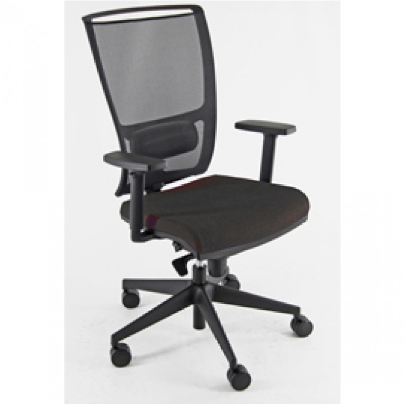 Poltrona semidirezionale H12 (adatta per uso intenso). Schienale alto in rete nera con supporto lombare regolabile. Rivestimento seduta in acrilico ignifugo. Braccioli regolabili e base in nylon. Meccanismo syncro. Meccanismo anti shock, meccanismo a contatto permanente. Schienale regolabile up-down. sedile con traslatore regolabile in profondità. Elevazione a gas.