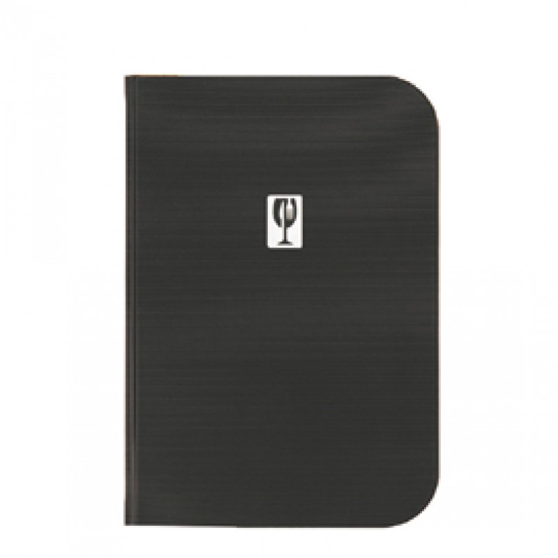 Portamenù in PVC nero motivo rigato in formato A4 o A5. Placca di metallo stilizzata sulla copertina. Formato da 4 buste trasparenti saldate sul dorso e 2 buste saldate sulle facce interne della copertina (per contenere in totale di 10 fogli). Dimensioni: 31,5x24cm.