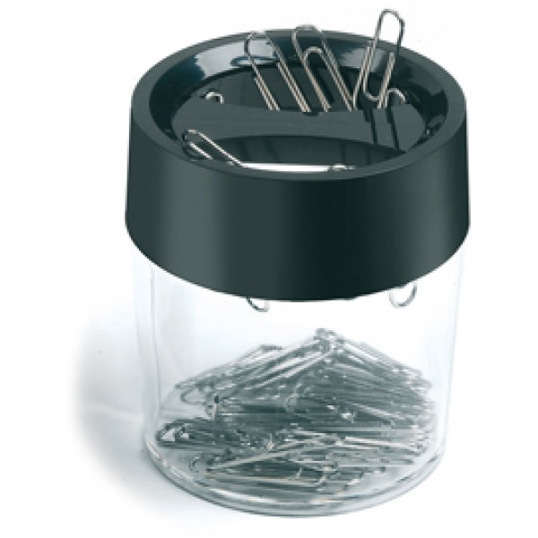 Portafermagli con coperchio calamitato in plastica trasparente, di forma cilindrica. Formato da due spazi separati per differenti fermagli, dimensioni: 5,8x6,8cm.
