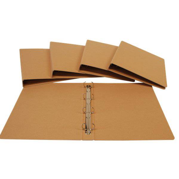 Raccoglitore ad anelli realizzato in robusto cartone indeformabile da 2 mm di spessore, riciclato e riciclabile al 100%. Meccanismo di alta qualità a 4 anelli tondi diametro 30 mm. Colore avana.