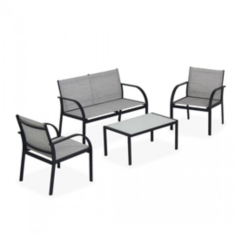 Set composto da un tavolino, un divano e due poltrone. Struttura in acciaio verniciato con vernici epossidiche di colore nero, rivestimento in textilene grigio mélange. Tavolo rettangolare con top in vetro temperato spessore 5mm. Il set è consegnato smontato e contenuto in un unico cartone.Articolo destinato ad esclusivo uso domestico. Non adatto ad uso pubblico.Set composto da:1 tavolino H38 x P45 x L80cm 2 poltrone H76,5 x P63 x L58,5cm 1 divano H76,5 x P63 x L108cm
