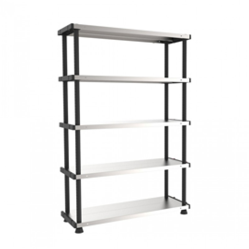 Scaffale composto da 4 montanti verticali in plastica nera con piedini regolabili in altezza. 5 ripiani in metallo regolabili con profondità di 45cm con portata massima di 120Kg per ripiano. Montaggio dello scaffale stimato in 10". Possibilità di fissaggio a parete.