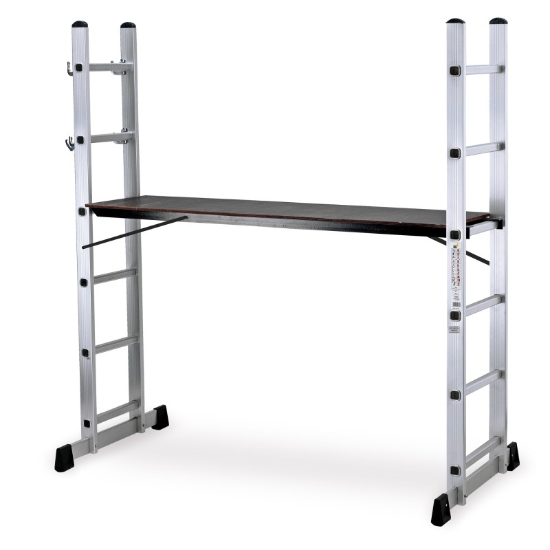 Trabattello in alluminio Everest a 6 gradini. Trasformabile in doppia scala o scala allungabile. Misure a Trabattello 40x160xH168cm. Consigliata per uso domestico e bricolage. Prodotto testato da SGS e conforme alla normativa Europea UNI EN 131. Portata massima: 120kg.