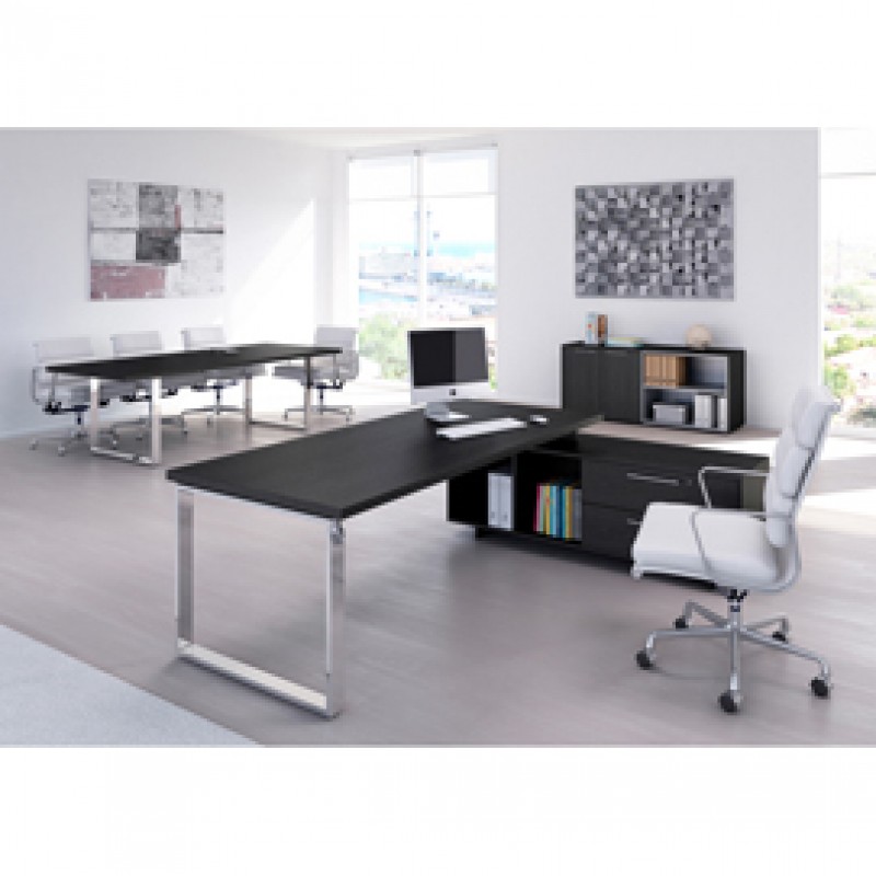 Scrivania con mobile di servizio portante reversibile destro o sinistro. Desktop sp. 38mm con bordo antishock in ABS 2mm. Mobile di servizio portante: struttura sp. 18mm, due ampi cassetti (il primo con serratura, dms. utili 72 x 37,5 x 17h cm) con eleganti e robuste maniglie in metallo, 2 vani a giorno (dms. utili 37,7 x 48,2 x 42,4h cm). Scrivania direzionale L210 x P90 x H74cm, mobile servizio reversibile DX e SX - L160 x P50 x H54cm. Ingombro totale: 255x170xH74cm