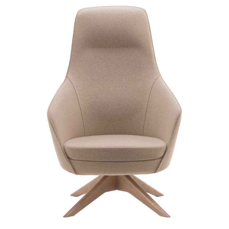 Poltroncina su basamento girevole in legno di frassino verniciato. Rivestimento seduta in tessuto "P..