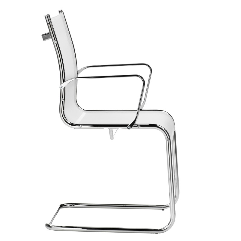 Seduta visitatore in acciaio cromato. Rivestimento seduta in rete di colore bianco. Braccioli inclusi (non rimovibili). Alt.tot.: 89cm; Prof.tot.: 62cm; Alt.schienale: 41cm; Larg.schienale: 48cm; Larg.seduta: 50cm; Prof.Sedile: 50cm.