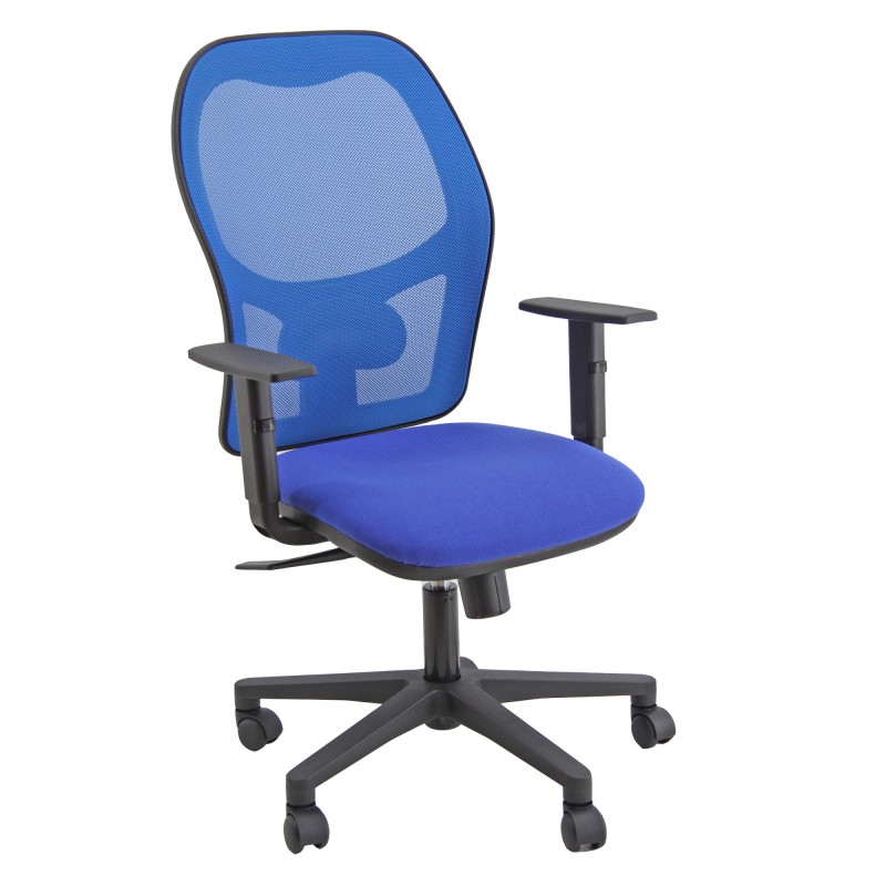 Seduta operativa girevole su ruote con schienale in rete blu- elevazione a gas - supporto lombare regolabile - meccanismo syncro tra sedile e schienale, a contatto permanente - schienale con ritorno controllato 3 blocchi. Rivestimento seduta in tessuto "ECO- Eco" 100% polipropilene. Completa di braccioli regolabili. Alt.tot.: 102-113cm; Prof.tot.: 63cm; Alt.schienale: 60cm; Larg.schienale: 48cm; Larg.seduta: 48cm; Prof.Sedile: 46cm; Alt. sedile: 42-54cm.
