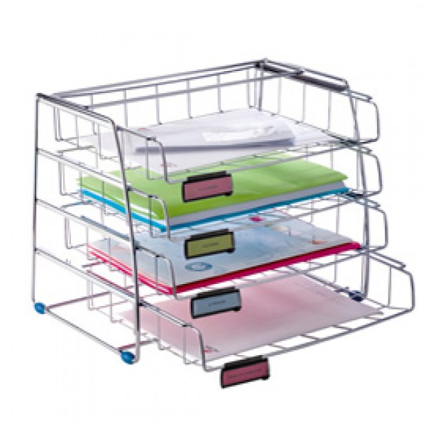 Set di 4 vaschette portacorrispondenza scorrevoli realizzate in robusta struttura in filo di metallo cromato e portaetichette in plastica per la personalizzazione del contenuto. Adatta a contenere documenti fino al formato 24x32cm. Ogni vaschetta ha capacità 6,5cm. Dimensioni: 39x30cm h 31,5cm