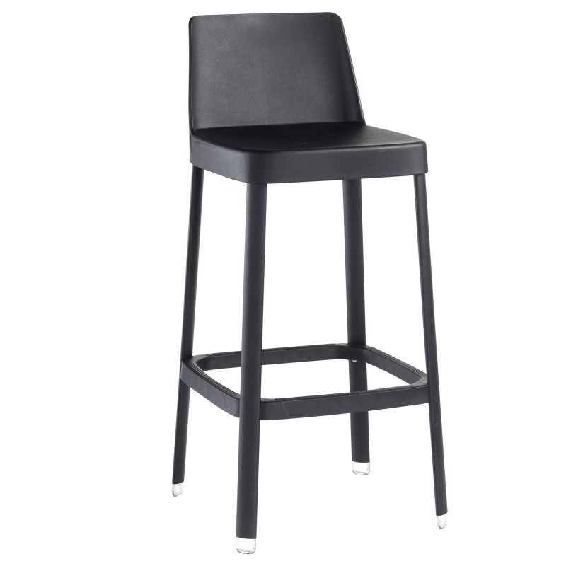 Sgabello alto 100% polipropilene - struttura in acciaio tubolare sezione ovale - senza braccioli. Alt. tot: 95cm; Prof.tot: 43cm; Alt.schienale: 22,5cm; Largh.schienale: 38cm; Largh. sedile: 38cm; Prof.sedile: 37cm; Alt.sedile: 75cm.