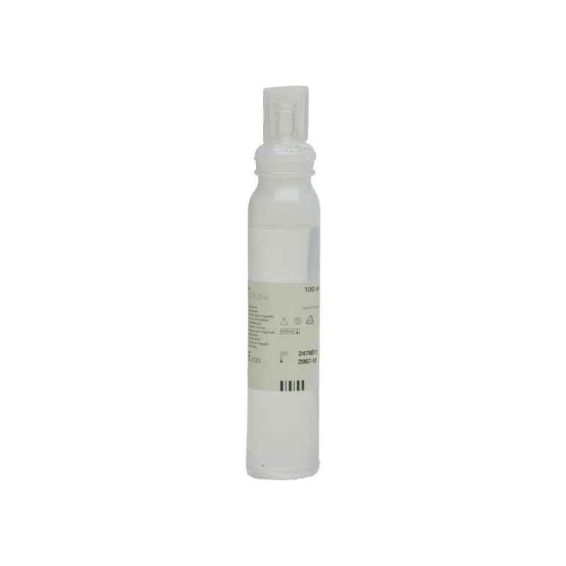 Soluzione salina 0,9%, sterile monouso per lavaggi di ferite e abrasioni, in contenitori di polietilene riciclabili.