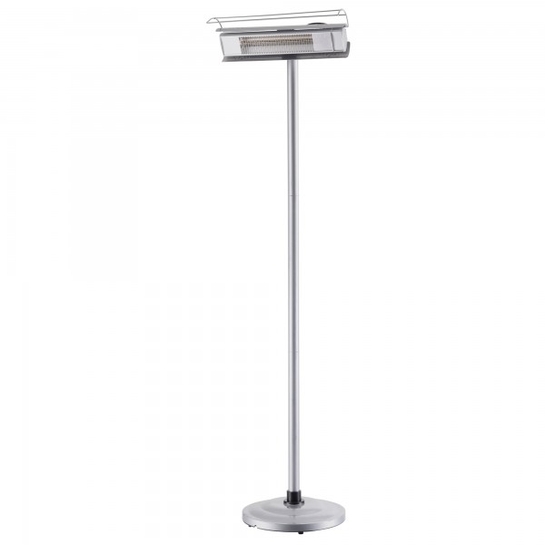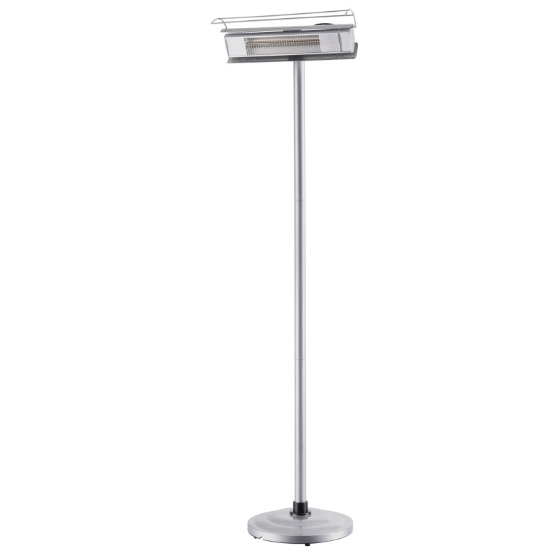 stufa a infrarossi da esterno/interno 1500W. Base poco ingombrante, Adatto a bar e locali ristorazione. Installabile su piedistallo o a parete. Grado di protezione: IP65 (resistente all’acqua). Elemento radiante: lampada ad infrarossi rivestita oro. Alimentazione: 220-240V ~ 50/60 Hz. Potenza effettiva: 1500 W. Superficie riscaldabile: 20mq. Dotazioni: piedistallo a base tonda (poco ingombrante), protezione anti-contatto accidentale con materiali infiammabili come tende, tessuti, ecc. resistenza di ricambio inclusa, cavo di alimentazione 2,2 metri H05RN-F 3G1.0, spina schuko. Materiale: stufa in acciaio inox, piedistallo in acciaio. Colore: argento. Dimensioni: altezza 2,10 m circa / 45 x 54 x 210 cm, diametro asta 48 mm. Peso: 15,8 Kg