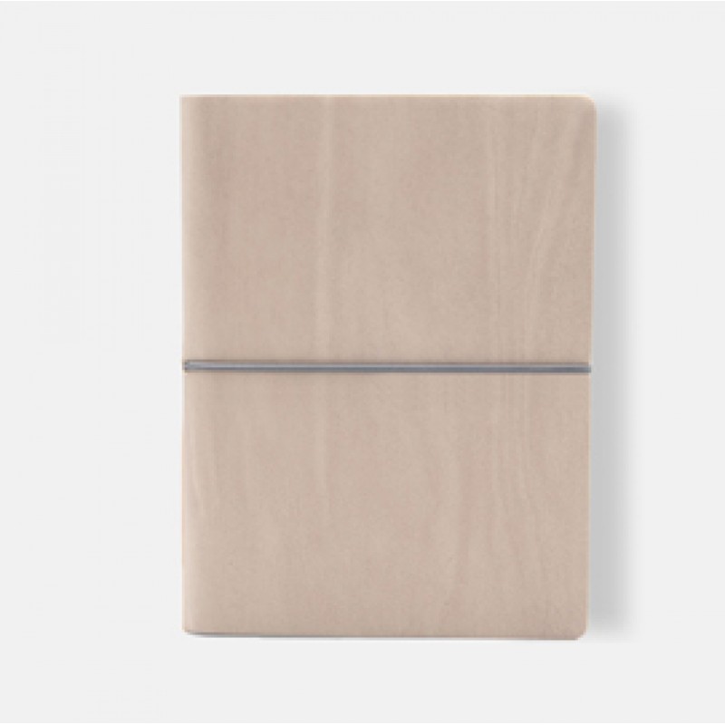 Taccuino con copertina in sintetico effetto liscio. Morbida, resistente e flessibile. Chiusura con elastico orizzontale. Carta riciclata colore avorio. Fatto a mano in Italia.