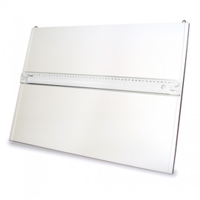 Tavoletta per disegno con leggio formato 40x53cm. Tavoletta in truciolato di con lamina in formica bianca. Fornita con riga da 50cm munita di guscette. Scorrimento della riga su binari di filo.
