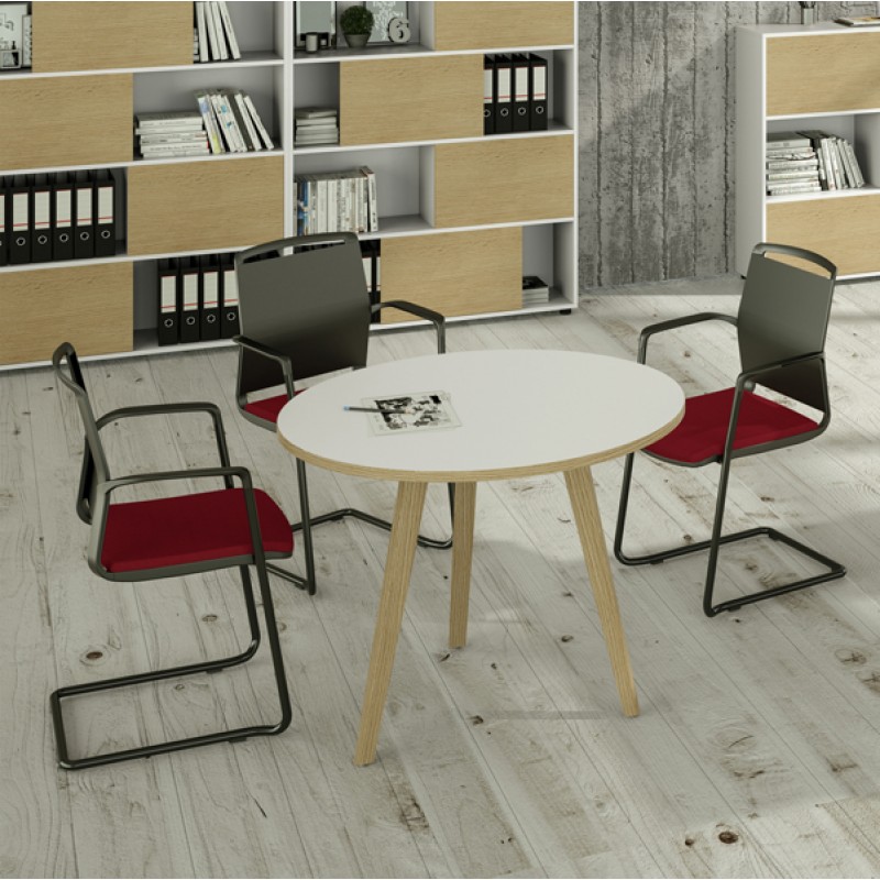 Linea di arredo operativo dal design confortevole ed essenziale caratterizzata dalle preziose gambe in LEGNO MASSELLO inclinate delle scrivanie e dei tavoli rotondi. Robusti piani in melaminico sp. 22 mm con bordo antishock resistente agli urti in ABS 3 mm. Gambe in legno massello complete di piedini livellabili in altezza. Piani In materiale bilaminato nobilitato melaminico spessore 22 mm conforme norme UNI e EN classe E1.