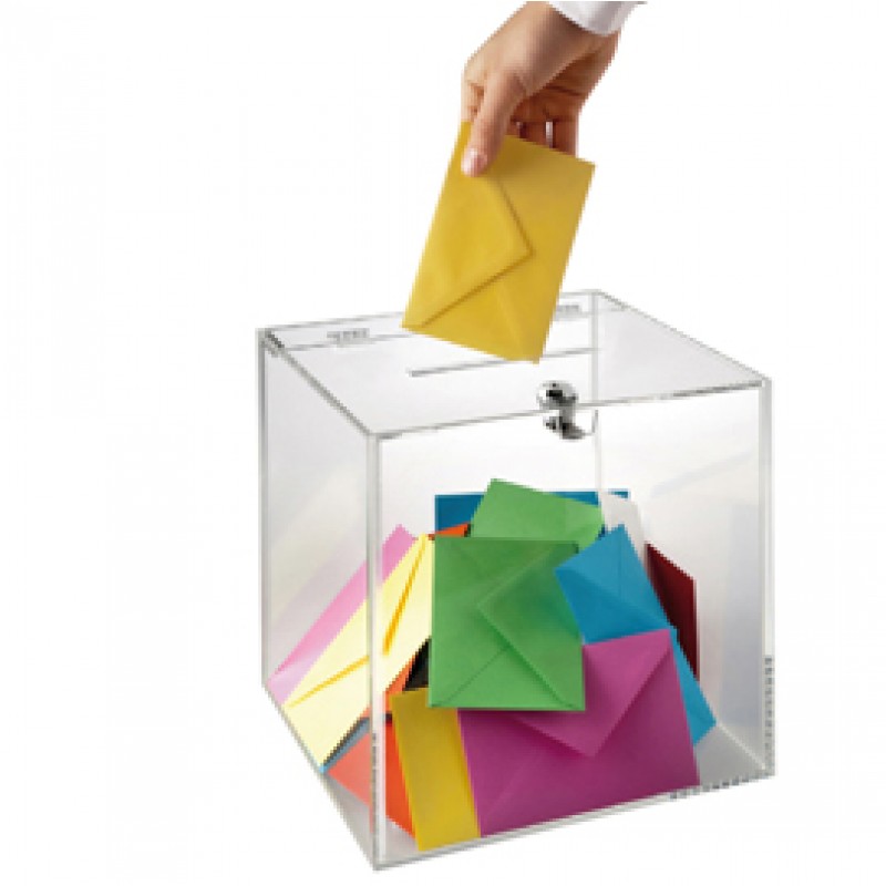 CONTENITORE AD URNA IN MATERIALE ACRILICO ALTAMENTE TRASPARENTE. DOTATO DI FESSURA SUL LATO SUPERIORE E CHIUSURA DI SICUREZZA CON SERRATURA E CHIAVE. IDEALE COME CONTENITORE DA BANCO PER LA RACCOLTA DI SUGGERIMENTI, COME ESPOSITORE E COMPLEMENTO D'ARREDO PER NEGOZI E VETRINE. DIMENSIONI: 25X25X25CM. La fessura è larga 12,5 cm.