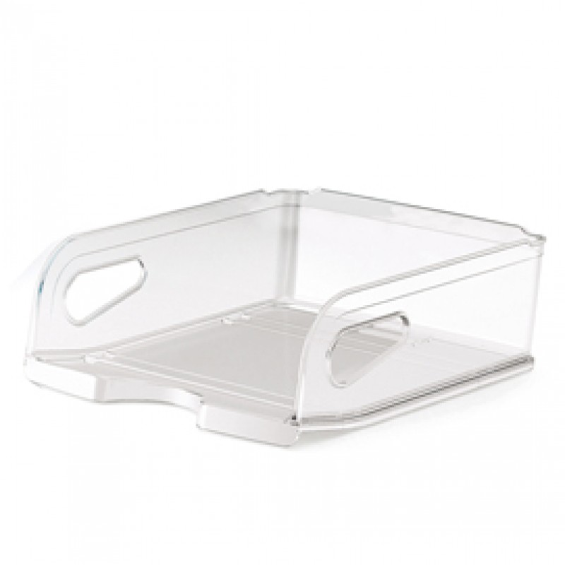 corrispondenza, cartelle o piccoli pacchi. Impugnature laterali. Per fogli formato A4 fino a 23x32cm. Sovrapponibile diritto o a scalare. Ampia apertura frontale che facilita l'accesso ai documenti anche quando sono impilati. Dimensioni: 345x278x110mm.