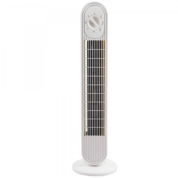 Ventilatore da terra Torre White a 3 velocità. AC 220-240 V -50 Hz. Decibel: 51,6 db (velocità max). Oscillazione orizzontale. Materiale: PP. Dotato di maniglia di trasporto e display manuale. Dimensioni: 20 x 79cm. Peso netto: 2,7kg.