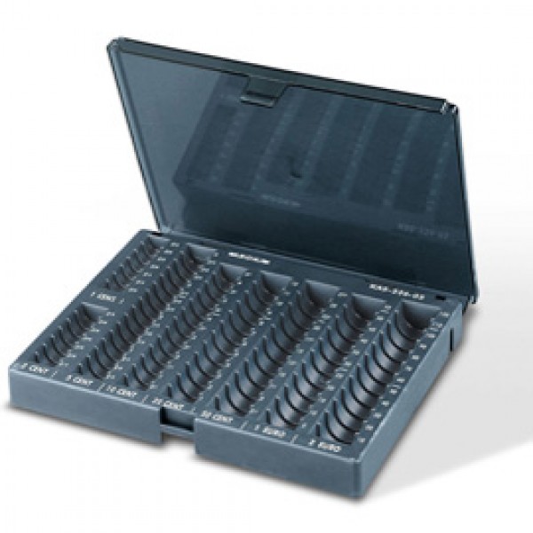 Vaschetta portamonete in polistirolo antiurto con coperchio trasparente amovibile. Colore grigio scu..