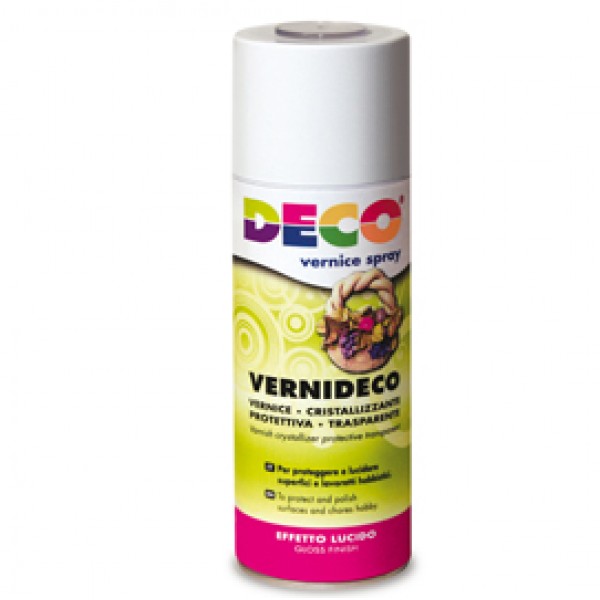 Vernice in spray cristallizzante trasparente che dona agli oggetti un effetto laccato e ceramico. Non ingiallisce nel tempo. Molto resistente alla luce e agli agenti atmosferici. Aderisce tenacemente ad ogni tipo di supporto (carta, tela, ceramica, porcellana, pasta di sale, argilla, creta, vetro, metallo, plastica, ecc) si utilizza semplicemente spruzzando sull'oggetto conferendo un aspetto brillante, lucido ed omogeneo. Conforme alle normative cee sulla sicurezza.