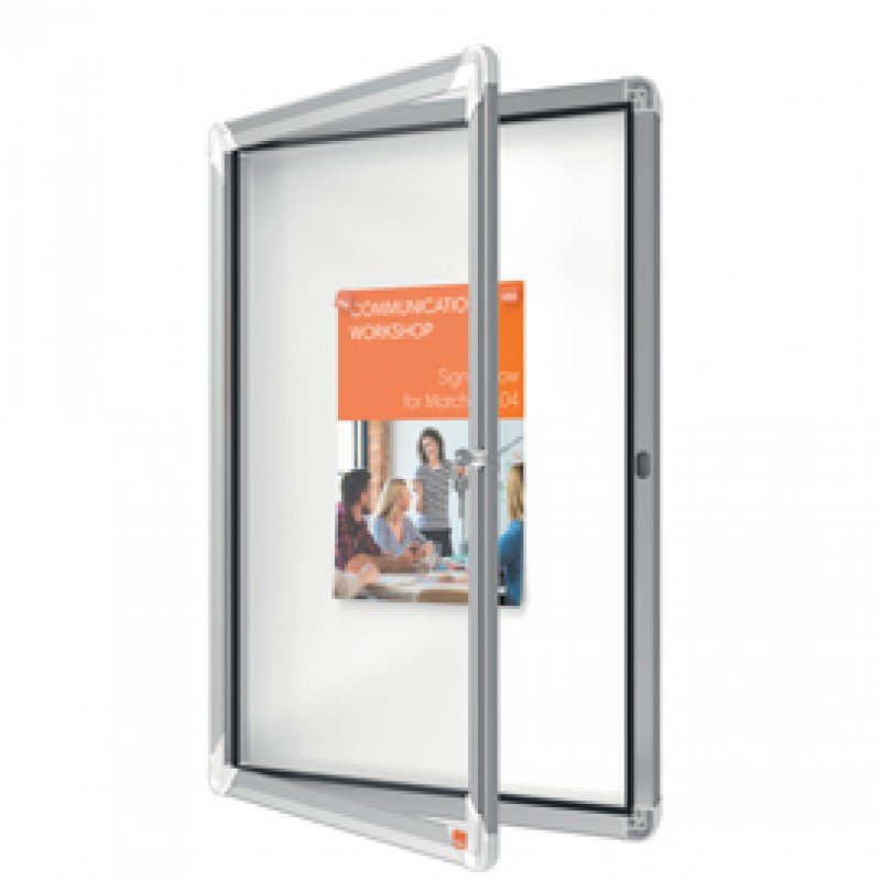 Ad anta battente. Nuovo design con robusta cornice in alluminio e vetro di sicurezza di 4mm. Fondo in acciaio bianco magnetico per uso con magnetini o scrivibile con pennarelli a secco. Fissaggio semplice effettuabile da una sola persona. Serratura con 2 chiavi. apertura istallabile sia a destra che a sinistra. f.to 4xa4: dim.est. 692x532x37mm