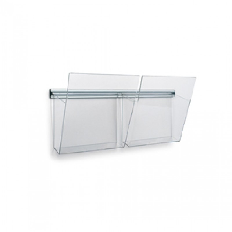 Barra in alluminio con tappini terminali grigi. e tappi di fissaggio. Completo di 2 tasche portadepliant vision A4 in polistirene trasparente neutro. Dimensioni (lxhxp): 50x14x25cm.