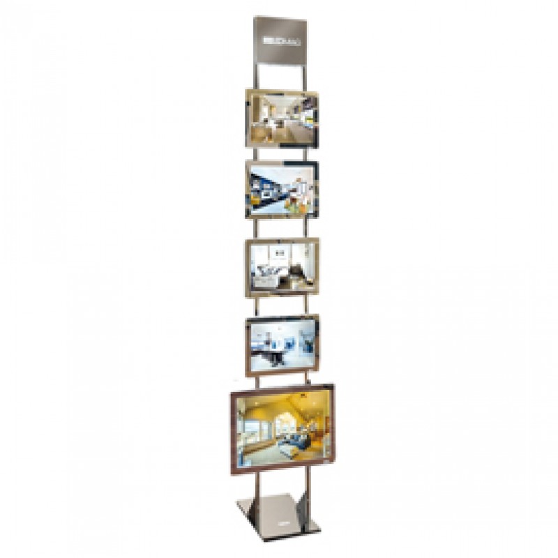 Espositore con 4 cornici A4 + 1 cornice A3 orizzontale magnetiche retroilluminate a led e struttura autoportante in acciaio cromato, che alimenta le cornici attraverso il trasformatore a bassa tensione posto alla base. Le cornici A4 possono essere posizionate sia in verticale che orizzontale; il solo contatto con la struttura ne consente l'accensione. Si possono applicare le cornici su entrambi i lati, aumentando così il numero di messaggi da esporre. Le immagini da inserire all'interno delle cornici sono facilmente sostutuibili.